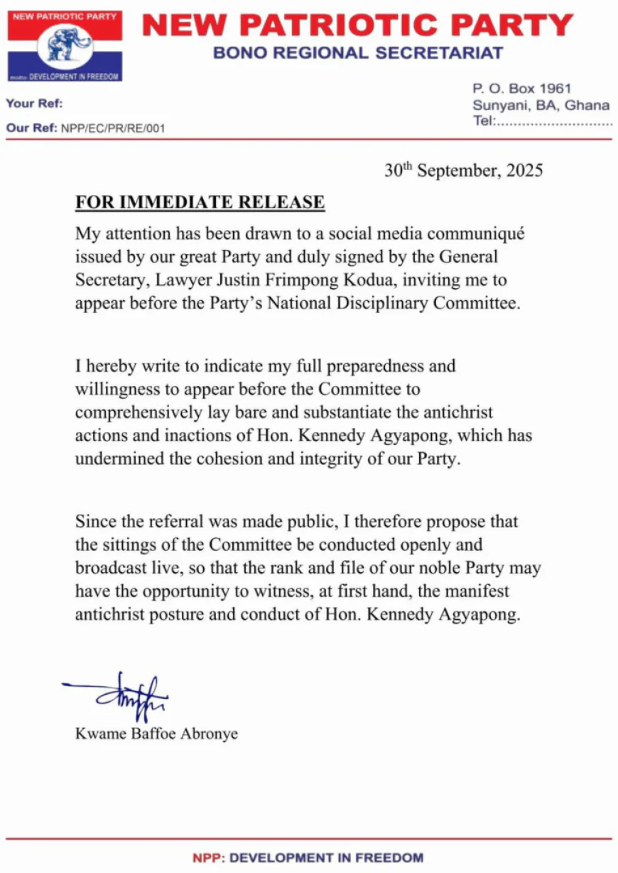 In a statement dated 30th September 2025, Abronye confirmed he is fully prepared to face the Committee and lay bare what he described as the “antichrist actions and inactions” of Assin Central MP, Hon. Kennedy Agyapong. According to him, such conduct has undermined the cohesion and integrity of the ruling party.