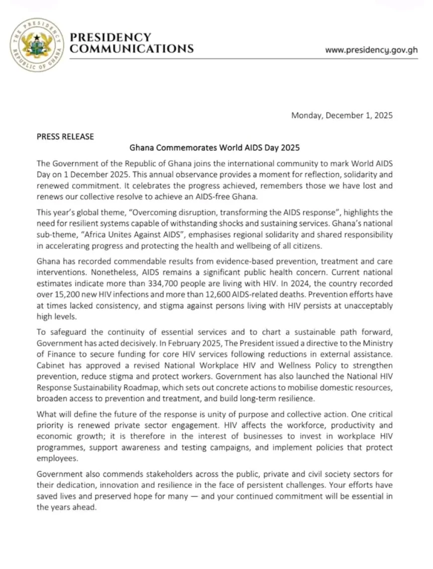 Government also commended stakeholders across the public, private, and civil society sectors for their resilience and dedication, noting that their contribution has saved lives and preserved hope for many. As Ghana strives for an AIDS-free future, the Presidency stressed that unity of purpose and collective action will remain central to sustaining progress.