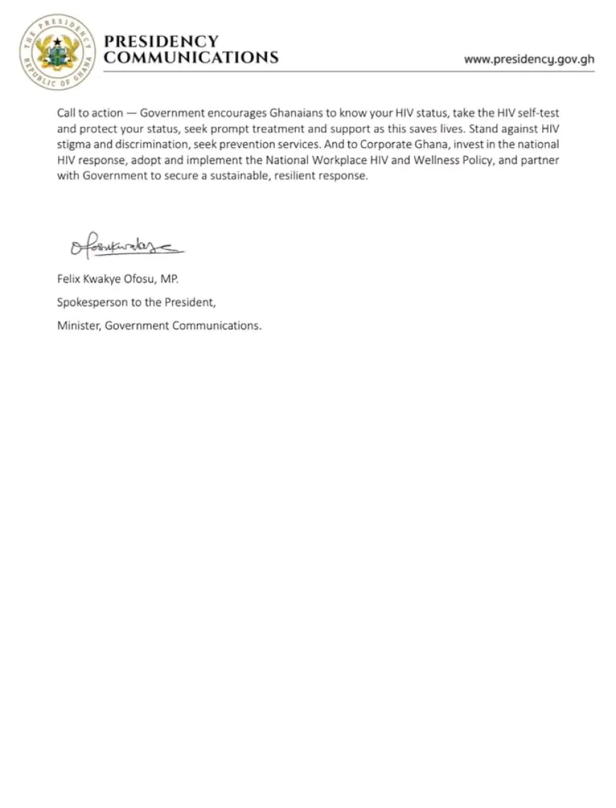 In a statement issued by the Minister for Government Communications and Spokesperson to the President, Felix Kwakye Ofosu, Government encouraged all Ghanaians to know their HIV status, utilise the HIV self-test kits now widely available, and seek treatment without delay. He urged citizens to stand firmly against stigma and discrimination, which continue to undermine national efforts.