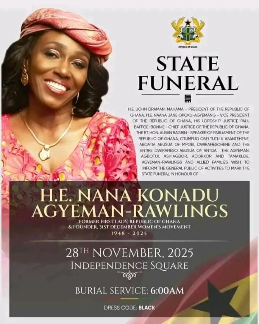 Ghana on Friday, 28 November, bid an emotional farewell to former First Lady, Her Excellency Nana Konadu Agyeman-Rawlings, whose burial ceremony at Independence Square drew hundreds of mourners, dignitaries, political leaders, and well-wishers from across the globe. She passed away on 23 October at the age of 76 after a short illness.