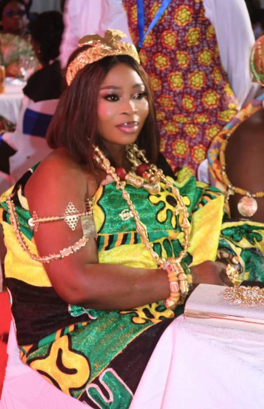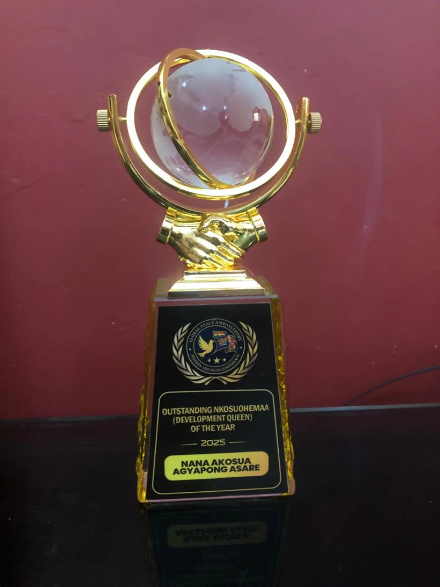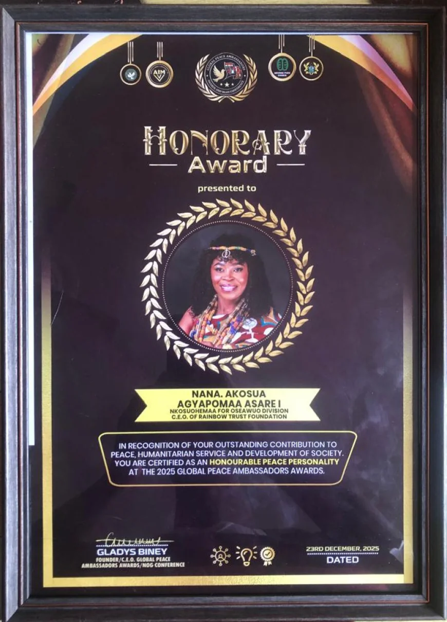 Nana Akosua Agyapomaa Asare, the Nkosuohemaa for the Oseawuo Division of Okyeman, has been honoured with a prestigious Peace, Humanitarian Service, and Development Award at the Global Peace Ambassadors Awards & NGOs Conference 2025, held on Tuesday, December 23, 2025, at the British Council Auditorium in Accra. The award recognised her exceptional service to humanity and her unwavering commitment to peacebuilding, education, cultural empowerment, and community development across Ghana.