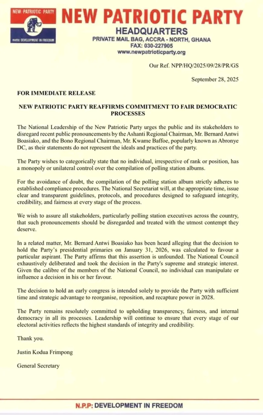 In a statement signed by General Secretary Justin Kodua Frimpong and dated 28 September 2025, the party urged the public and stakeholders to disregard comments made by Ashanti Regional Chairman Bernard Antwi Boasiako and Bono Regional Chairman Kwame Baffoe, popularly known as Abronye DC. The statement said the remarks made by the two did not represent the ideals and practices of the NPP.