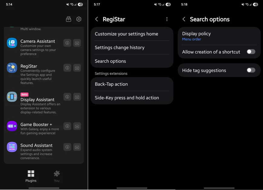 Once the 12.1 MB plug-in is downloaded, the next step is to open Registar on Good Lock. There is an option named” Search options.” After clicking that, the “Allow creation of a shortcut” should be enabled.
